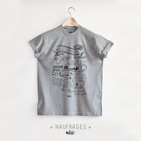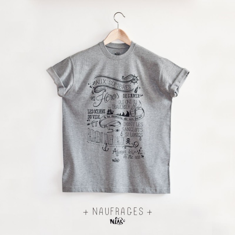 Tu te sens parfois comme un naufragé du quotidien ? Le T-shirt original NAUFRAGES est là pour toi. Inspiré de la chanson emblématique de Noir Désir, ce T-shirt confortable te plonge dans une ambiance marine et poétique. Avec sa typographie pirate et ses paroles illustrées, il rend hommage aux "sombres héros de l'amer". Parfait pour ceux qui aiment voguer entre les vagues du rock et les embruns de la mer.