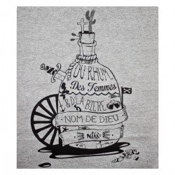 Motif : Sérigraphié à la main avec des encres à eau conformes à la norme Oeko-Tex 100, sans substances nocives. Le design met en scène une bouteille de rhum renfermant les paroles de la chanson, entourée d'éléments marins et du Far West.