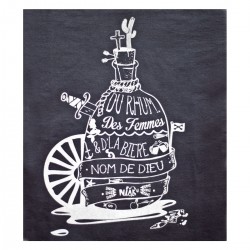 • Motif : Sérigraphie artisanale à l'encre à eau respectant la norme Oeko-Tex 100, sans particules nocives. L'illustration représente une bouteille de rhum contenant les paroles de la chanson, entourée de symboles marins et du Far West.